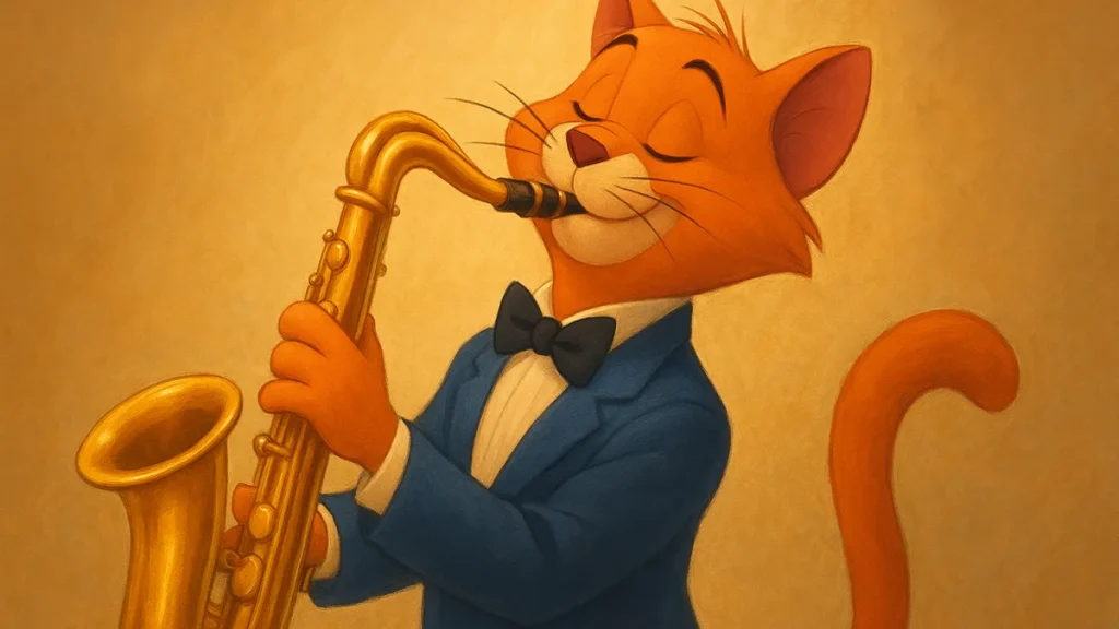O jazz usado no filme não é só trilha sonora. Ele dita passos, marca pausas e sugere pequenas coreografias. É fácil imaginar um gato jazzista dançando em um beco ou em um palco iluminado.